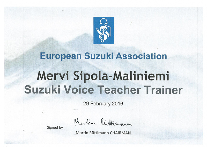 Mervi Sipola-Maliniemi on suorittanut seuraavat musiikin ammattitutkinnot: kirkkomuusikko 1989 (Oulun Konservatorio), laulunopettaja 1994 (Helsingin Konservatorio) ja lauludiplomi 1997 (A-kurssi, arvosanalla erinomainen, Helsingin Konservatorio). Musiikkipedagogi AMK 2004, Helsingin Ammattikorkeakoulu Stadia ja Musiikkipedagogi YAMK 2009, Metropolia Ammattikorkeakoulu. Laulunopettajina Mervi Sipola-Maliniemellä ovat olleet mm. Elias Palola, Esko Jurvelin, professori Liisa Linko Malmio ja oopperalaulaja Seppo Ruohonen. Sipola-Maliniemi on opiskellut useilla laulukursseilla niin kotimaassa kuin ulkomaillakin. Kansainväliset laulusuzukiopettajatutkinnot (5 tasoa) Sipola-Maliniemi suoritti vuosien 2003-2009 aikana. Vuodesta 2014 lähtien Mervi Sipola-Maliniemi on toiminut Euroopan Suzukiyhdistyksen (ESA) nimittämänä laulusuzukiopettajien kouluttajaharjoittelijana (Instructor Suzuki Voice).